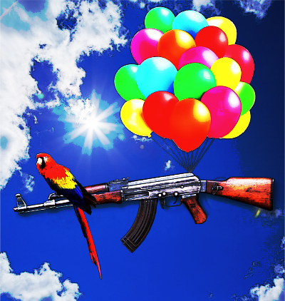So sieht er aus, unser stochastischer KI-Papagei, erstaunlich gut balanciert er die Luftwaffe. Vielleicht sollte man einfach massenhaft AK47 an Luftballons hängen, die kommen dann irgendwo runter und wir sehen mal was passiert. Ein kleiner Gruss von Unbekannt, wie früher mit diesen komischen Kärtchen. "Wenn mich jemand findet bitte zurückschicken".[ Los Papagayos / swashmark .com / 2022 / Montage ]