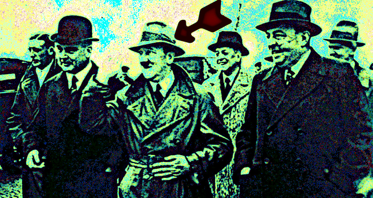 Adolf Hitler besichtigt Betriebe des Thyssen-Konzerns im Pott. Die Entourage der "Staats""führung" bilden Fritz Thyssen (rechts hinten), der Leiter der Vereinigten Stahlwerke AG Albert Vögler und Dr. Borbet, ein Industrieller des Bochumer Vereins. Fotograf/in unbekannt.