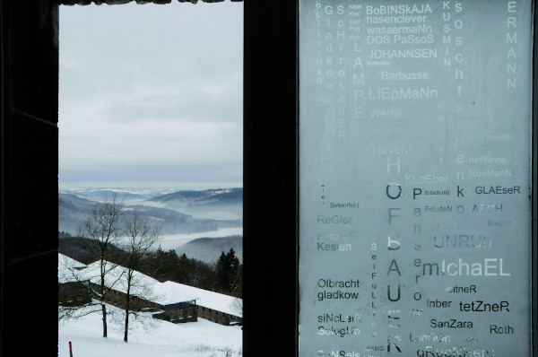 swashmark.com, 6 Monate Langzeitperformance / 6 Month long term performance / "vorübergehend" / "temporary" / April-Oktober 2010 / Vogelsang, Erinnerungszentrum / Vogelsang, Place of Remembrance / Schleiden-Gemünd, Germany / finally 1 of 3 hand scratched Windows of Nazi Building, Names of demonized Authors 1933-1945, View over Eifel Landscape through open window, what is now impossible with closed windows. You can only see the landscape through the names which "appear" while the window was scratched blind. Part II of "Asche"